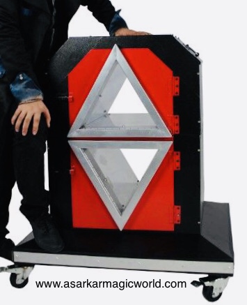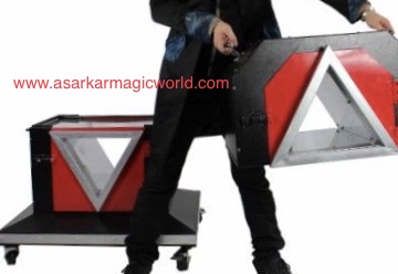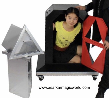 Magician shows a small box. Then puts his lady assistant in the box & put blade from the box middle. Then put two triangle shape durms inside the box & penitrate the durms. Then lift & separate the top part of the box to show the lady is cut of in two pieces. Then rejoin the box & removes the drums & blade. Again appear the lady safely by magical act.