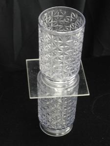The performer shows two clear empty glass tumblers, and a transparent plate. One empty tumbler is placed face up on the table, covered with the glass plate, and the other empty tumbler placed over this.