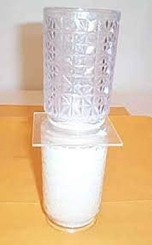 Milk or any other coloured liquid is now poured visibly into the tumbler on top till it is almost full.  The performer now places temporary screen (an open book or magazine) in front of the glass to hide the props for a few moments.  The screen is then blown or dropped down, and the liquid has magically transferred from the glass on top to the glass at the bottom.  The liquid can be poured from the glass at the bottom, or even given to an audience member to consume if it is a portable liquid.  An amazing penetration of liquid through the glass and plate.
