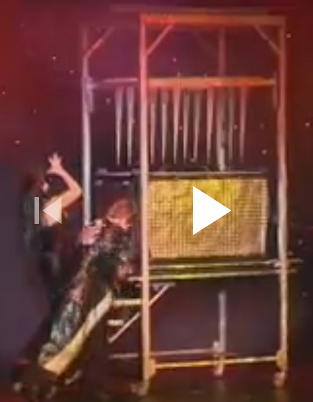 Magician locked in a bed by public. Top of the bed hanging spikes or knives are waiting to come down & crushed the Magician. The plate of spikes fall down but Magician jump on the top of spike plate Magically.