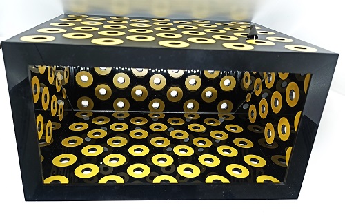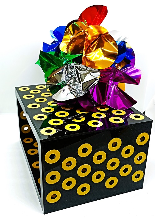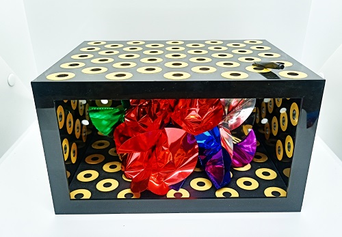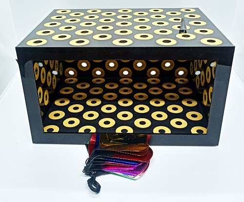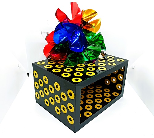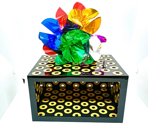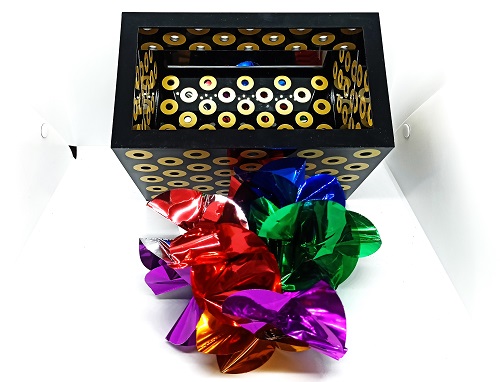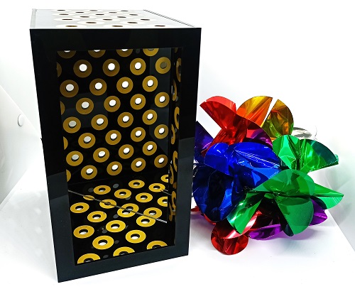MAGICIAN SHOWS AN EMPTY BLACK BOX FROM ALL SIDES. THE HE JUST MOVES HIS HAND INFRONT OF THE BOX, WOW A BEAUTIFUL FLOWER APPEARED INSIDE THE BOX. YOU MAY ALSO PRODUCE DOVE FROM THE EMPTY BOX. VERY NICE FINISHING. ANY SMALL THING YOU MAY APPEAR IN A SECOND OUT OF IT.