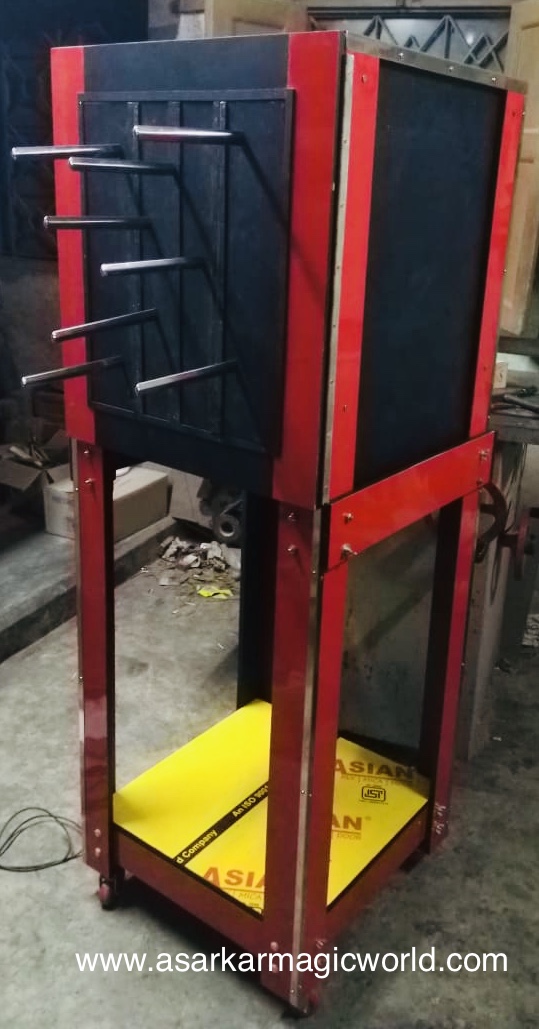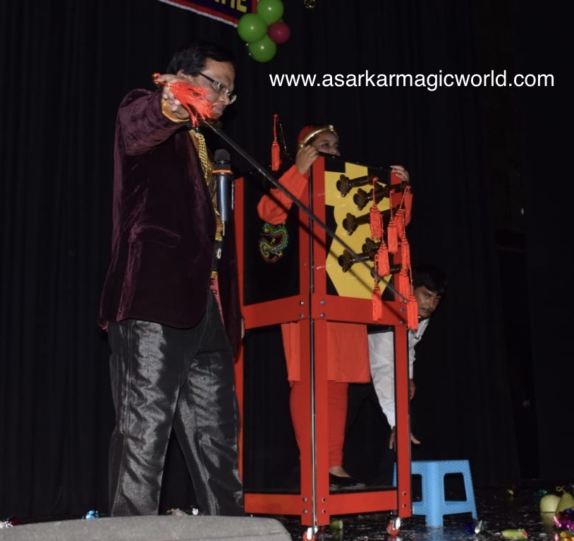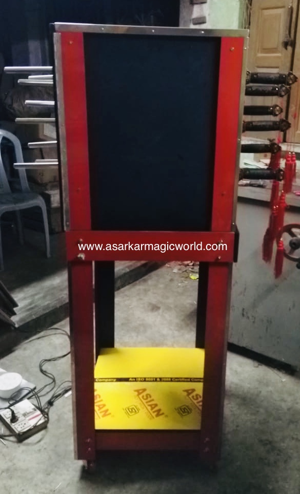 Magician shows a cabinet stand type box. Then puts his lady assistant inside the box & close the door. Then he takes sharp big size swords & puts the swords in the middle of the box. The swords penitrate the box as well as his assiatnt body. He moves the box back side to show really the sword penitrate the body & comes out from box opposite side. Then again he removes all the swords from the box & magically safely remove his lady assiastant back.