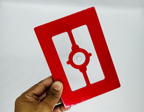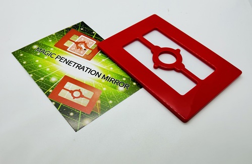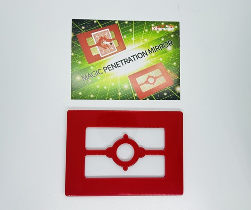 The Magician displays a clear plastic sheet in a decorative frame. The audience can examine this. Two playing cards or Visiting cards are now sandwiched in the frame with the clear glass between.