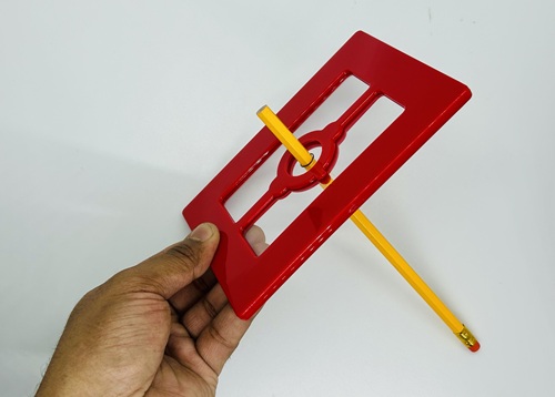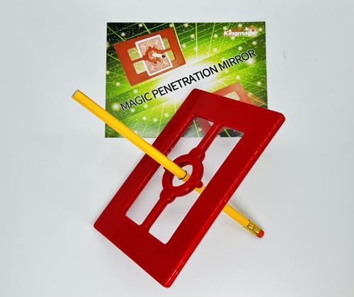 The magician pushes a pencil through the middle of the frame, making two holes in the cards. But when the cards are removed, the clear glass sheet is found to be entirely intact.