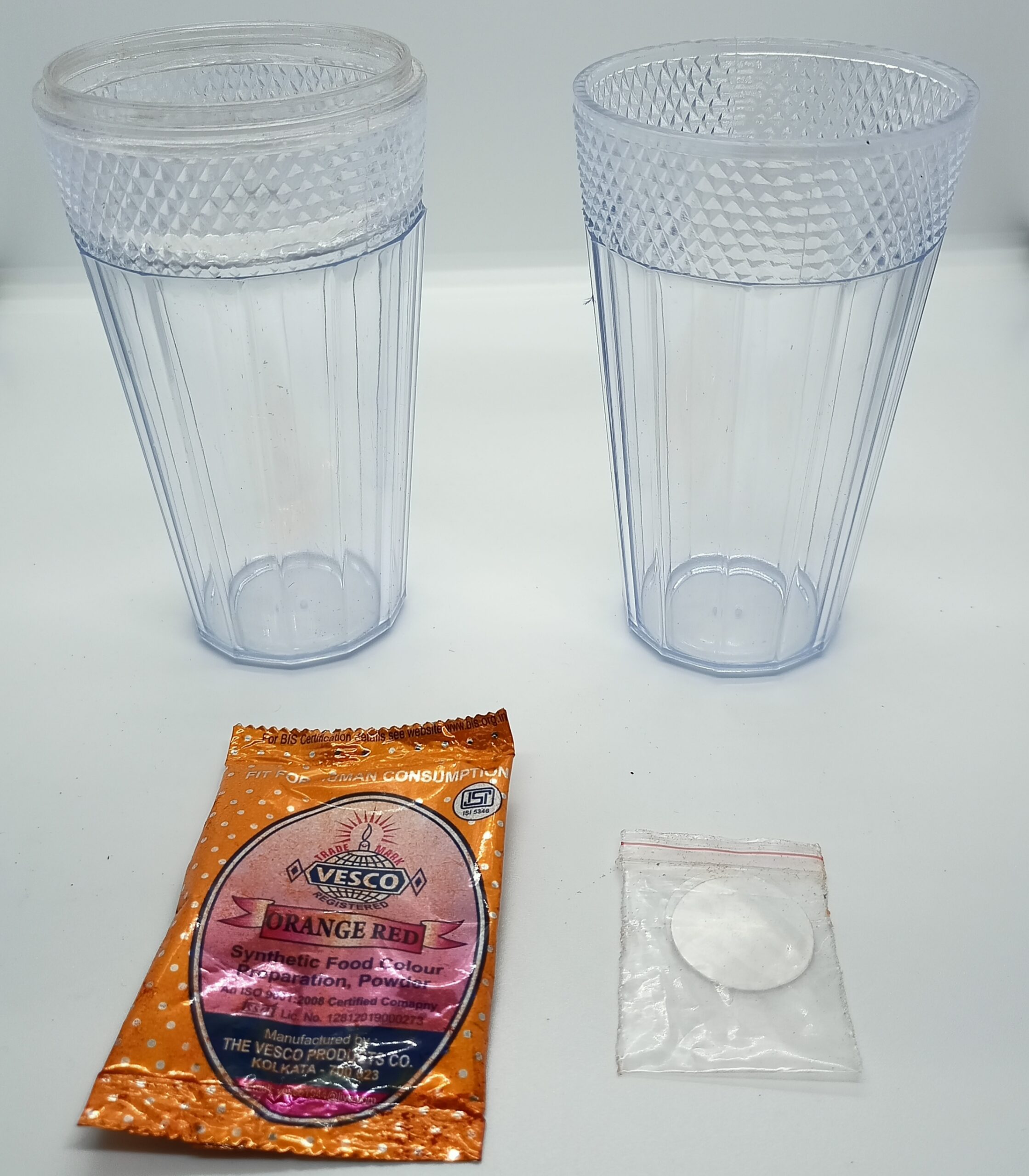 VERY GOOD QUALITY PLATIC GLASSES WITH FOOD COLOR & PLASTIC ROUND PAPERS.