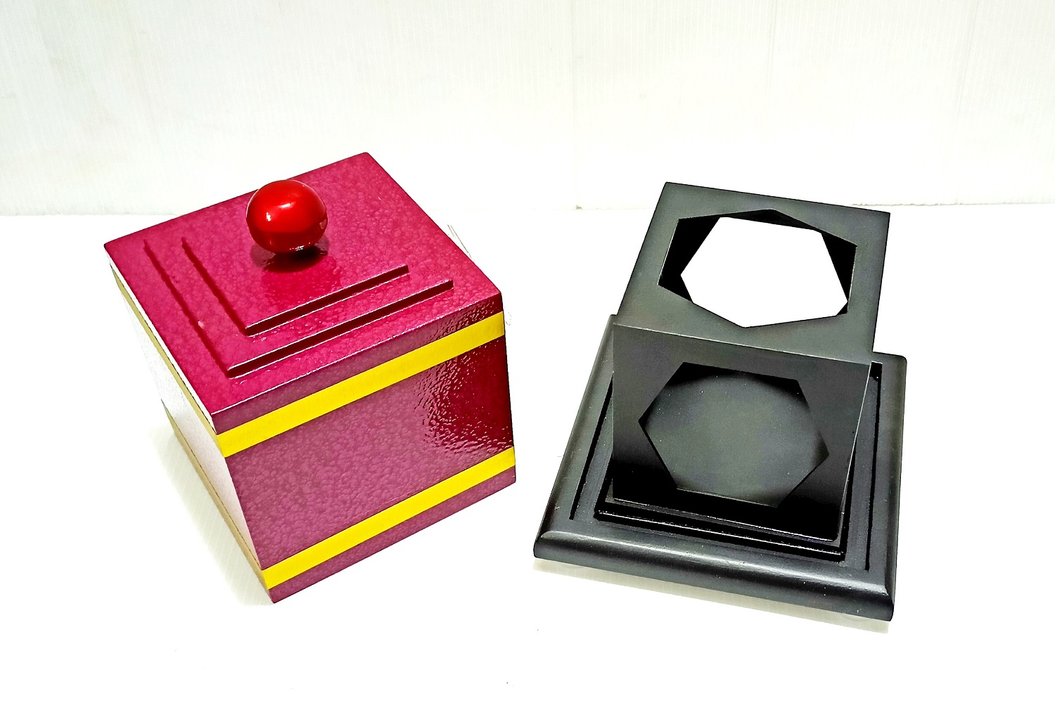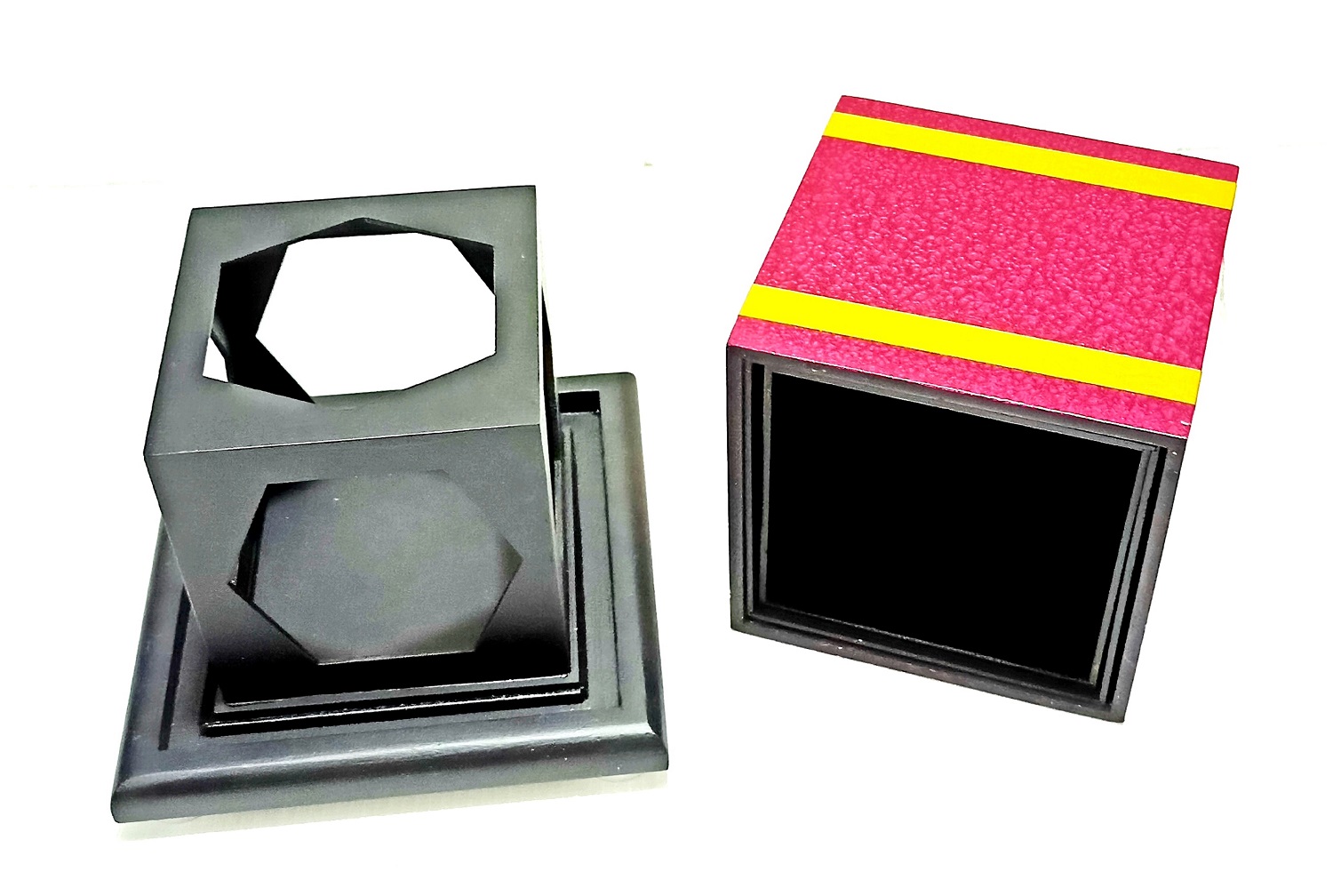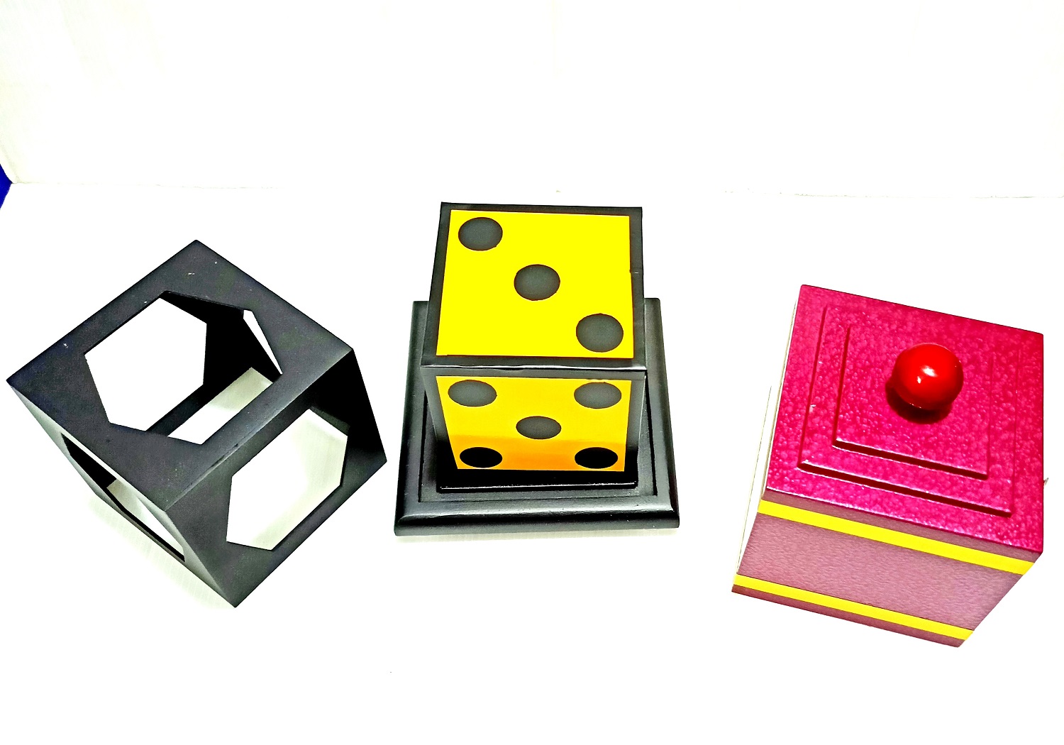 Magician shows an big dice. Then places it in a tray & covers it with a frame. Now cover the frame with dice again cover in a box. Finally after open the cover of the frame the dice is vanished. You may produces toffy, chocholate, hankey after vanising .