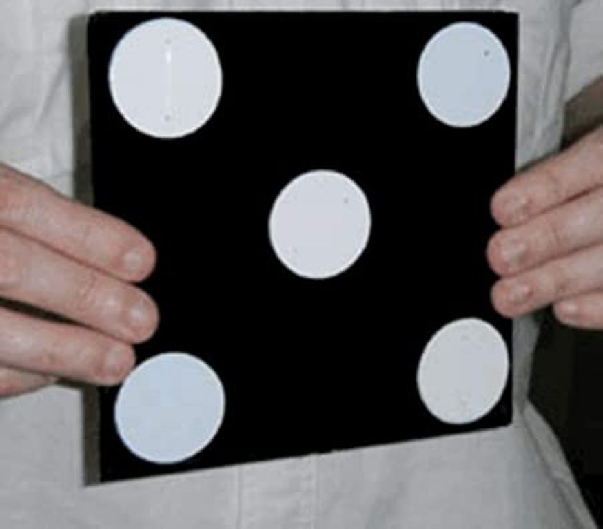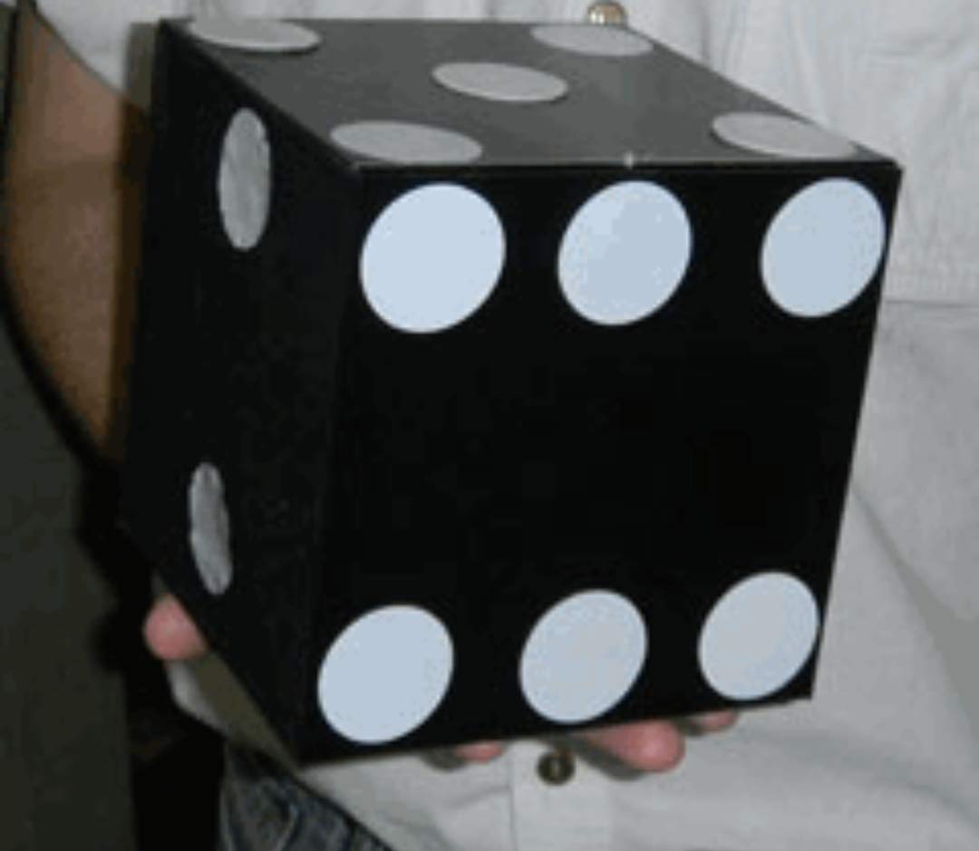 The performer shows a large square board (a flat die !), depicting a one spot on one side, and a six on the reverse.
