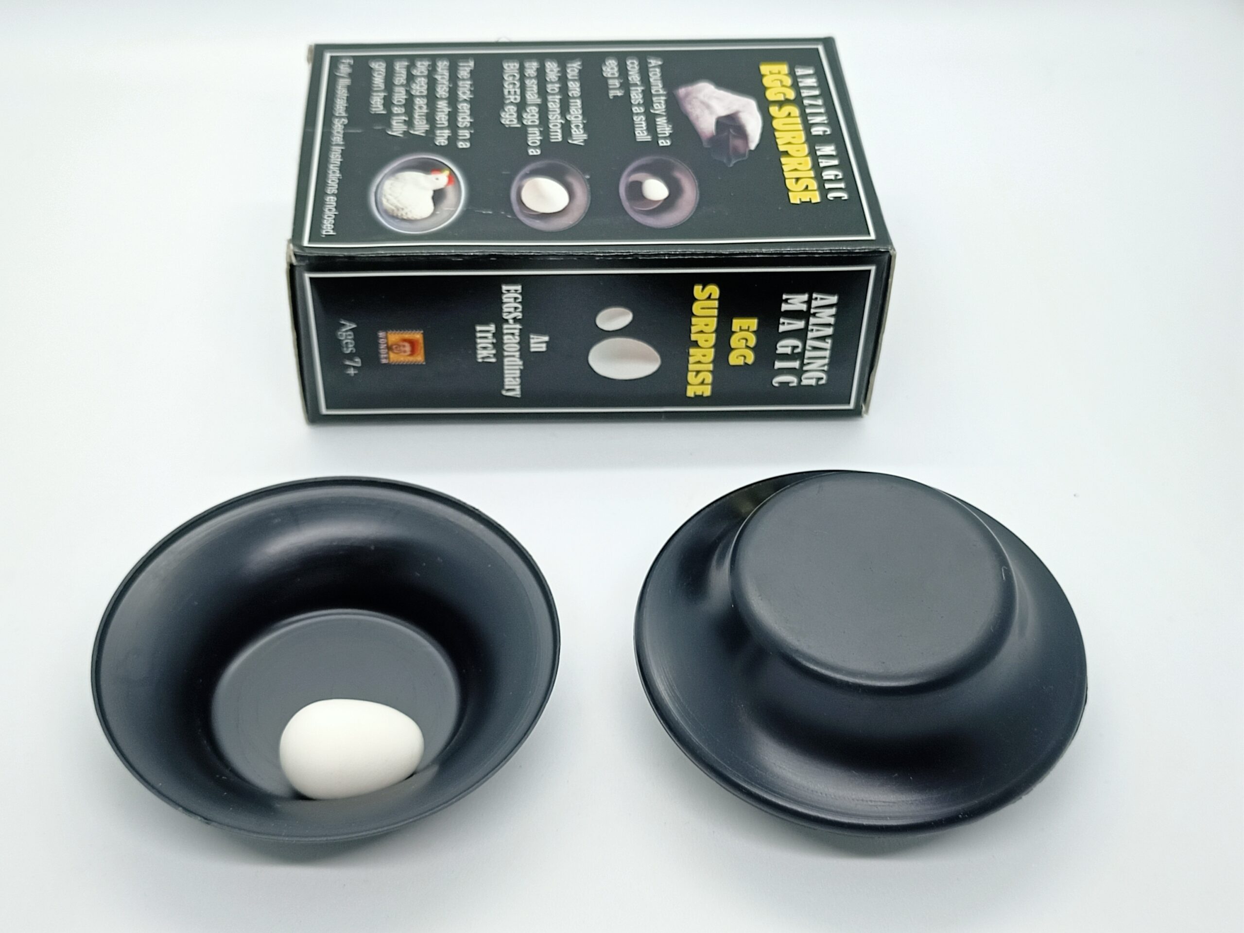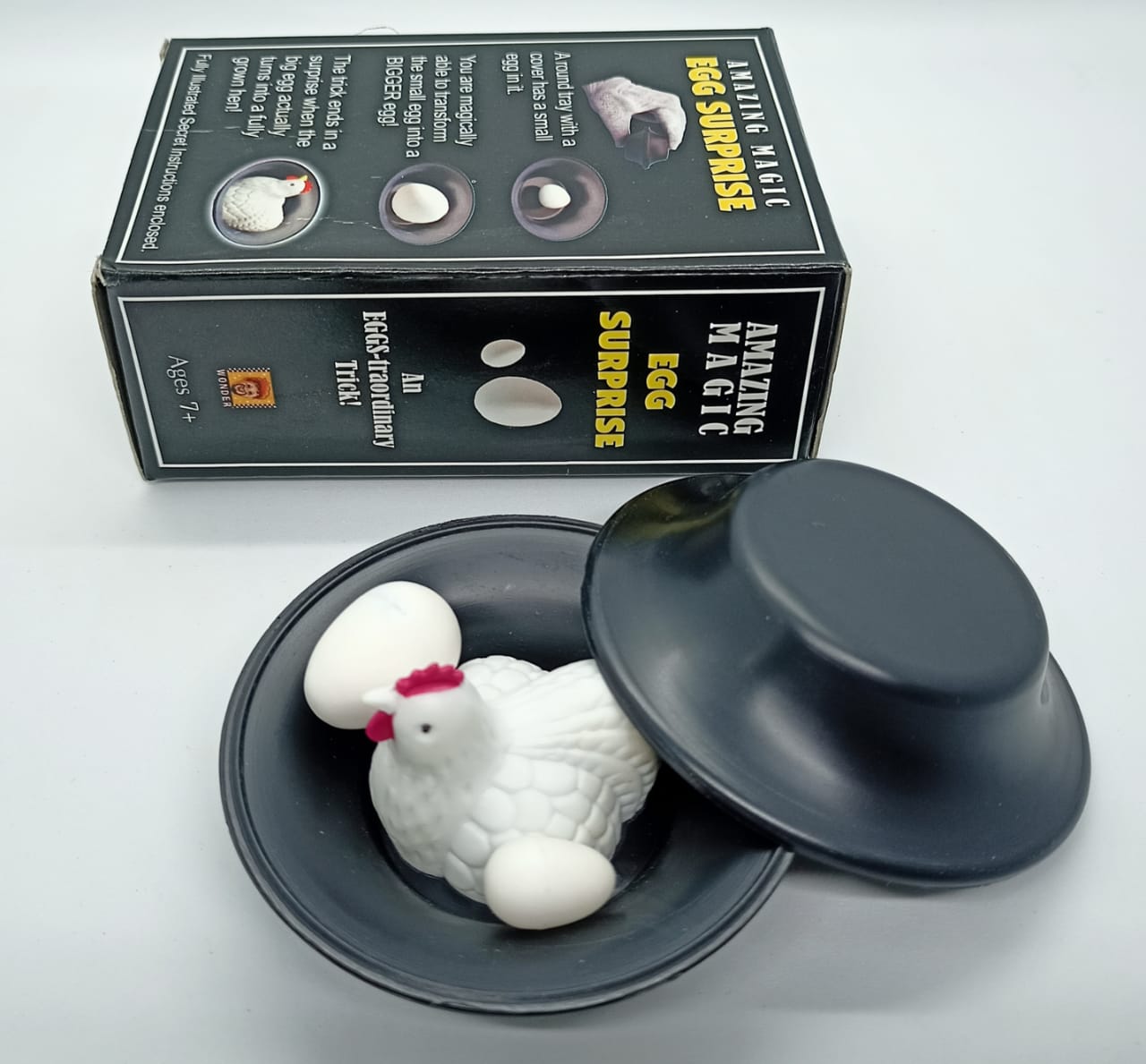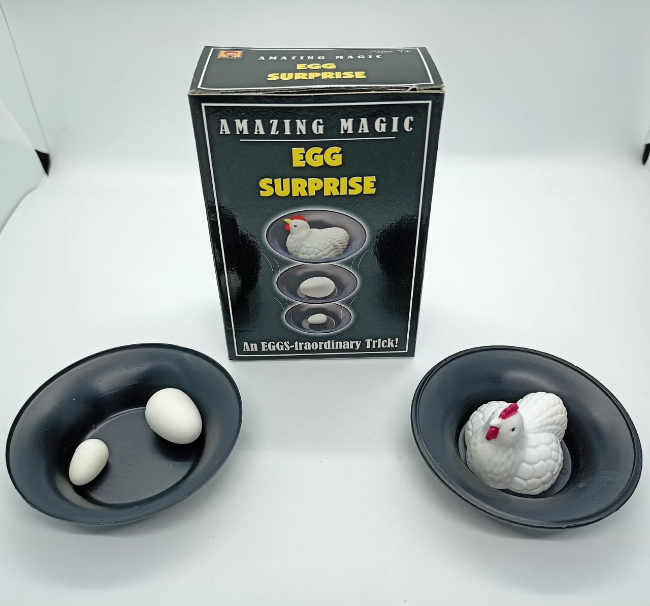 An egg magically appears between two empty plates. It can then transform into a chicken