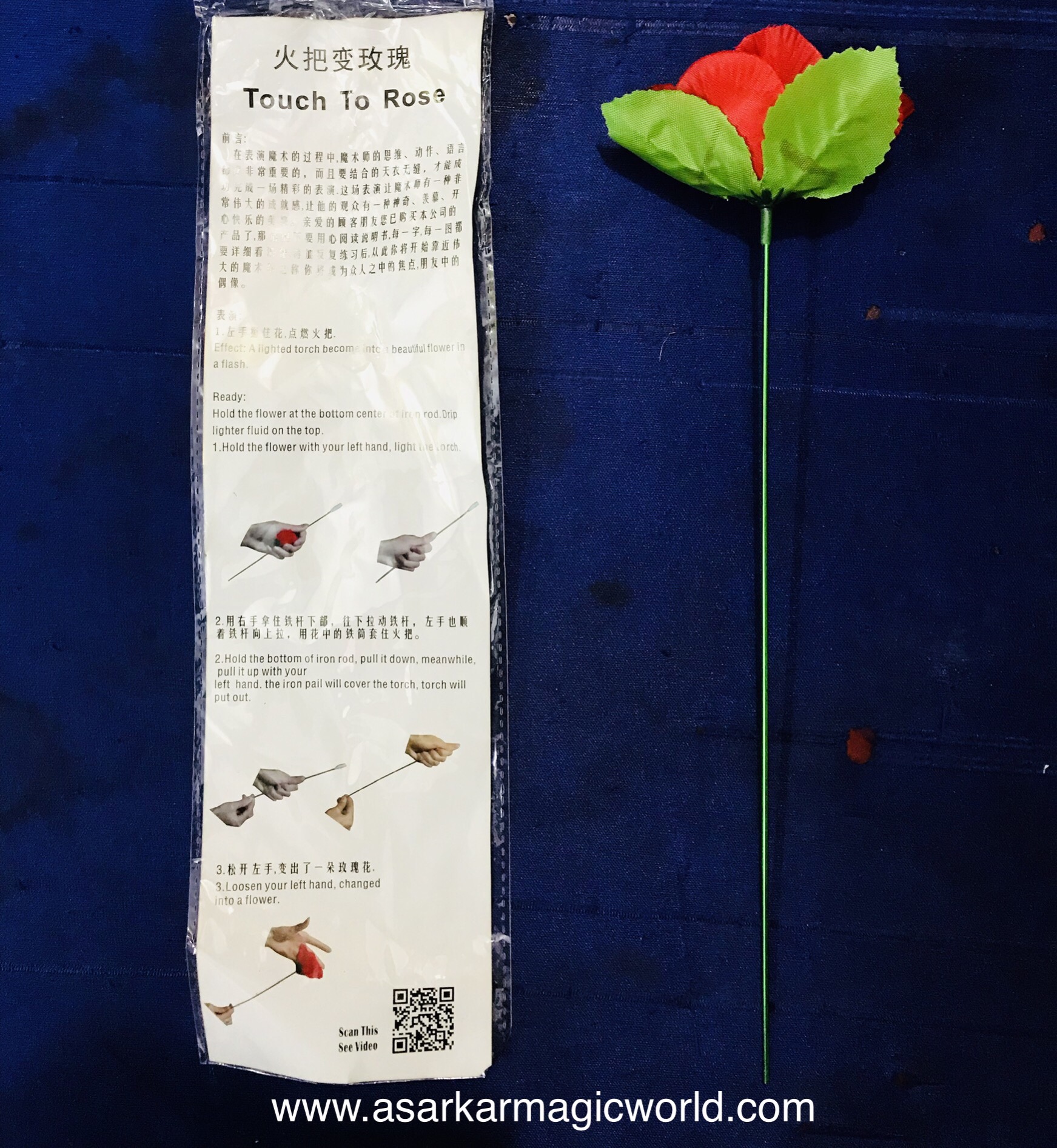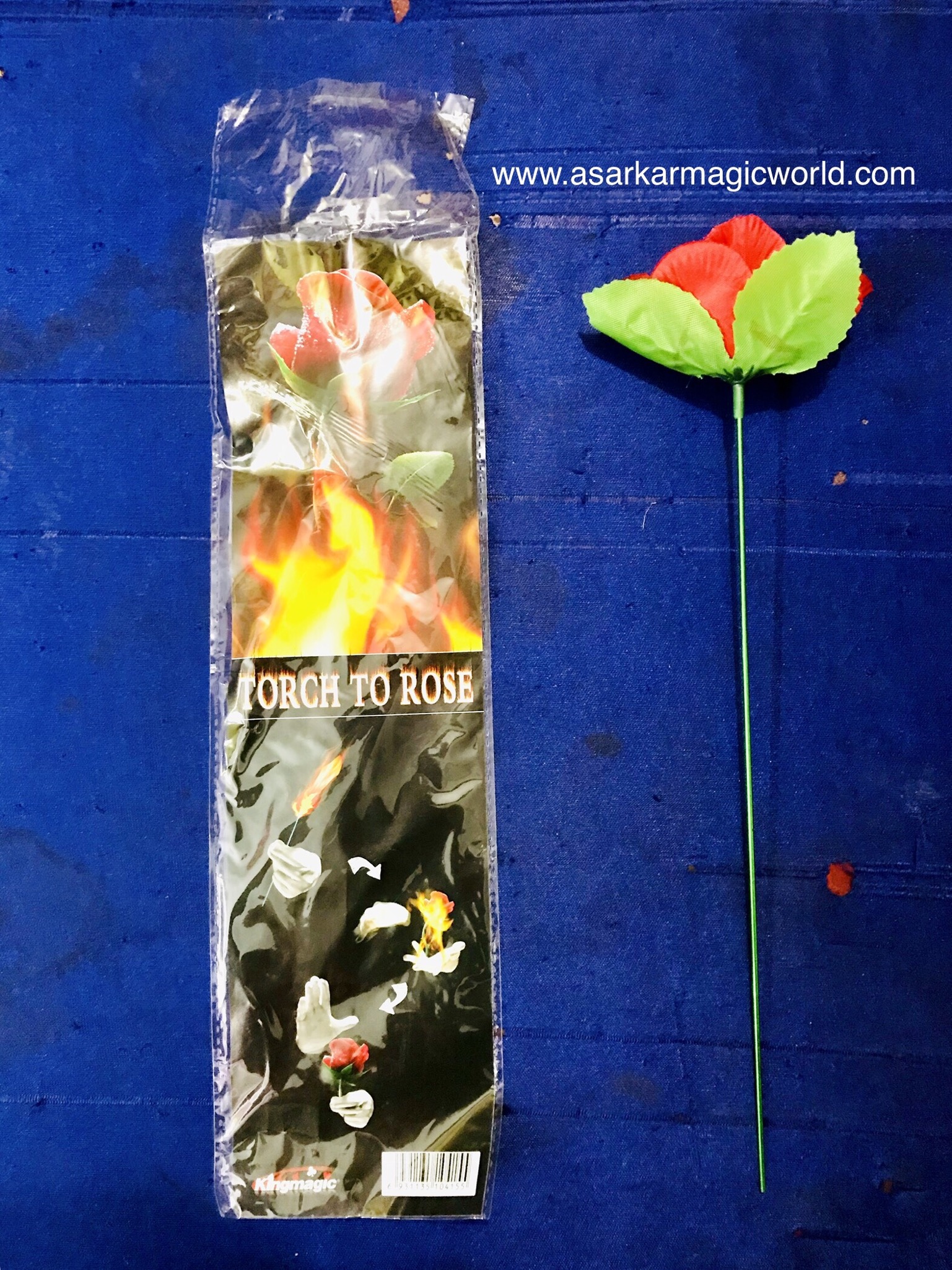 Magician Shows a fire thin stick. Then cover the fire with his palm. Fire flame turns into a Red Rose instantly.