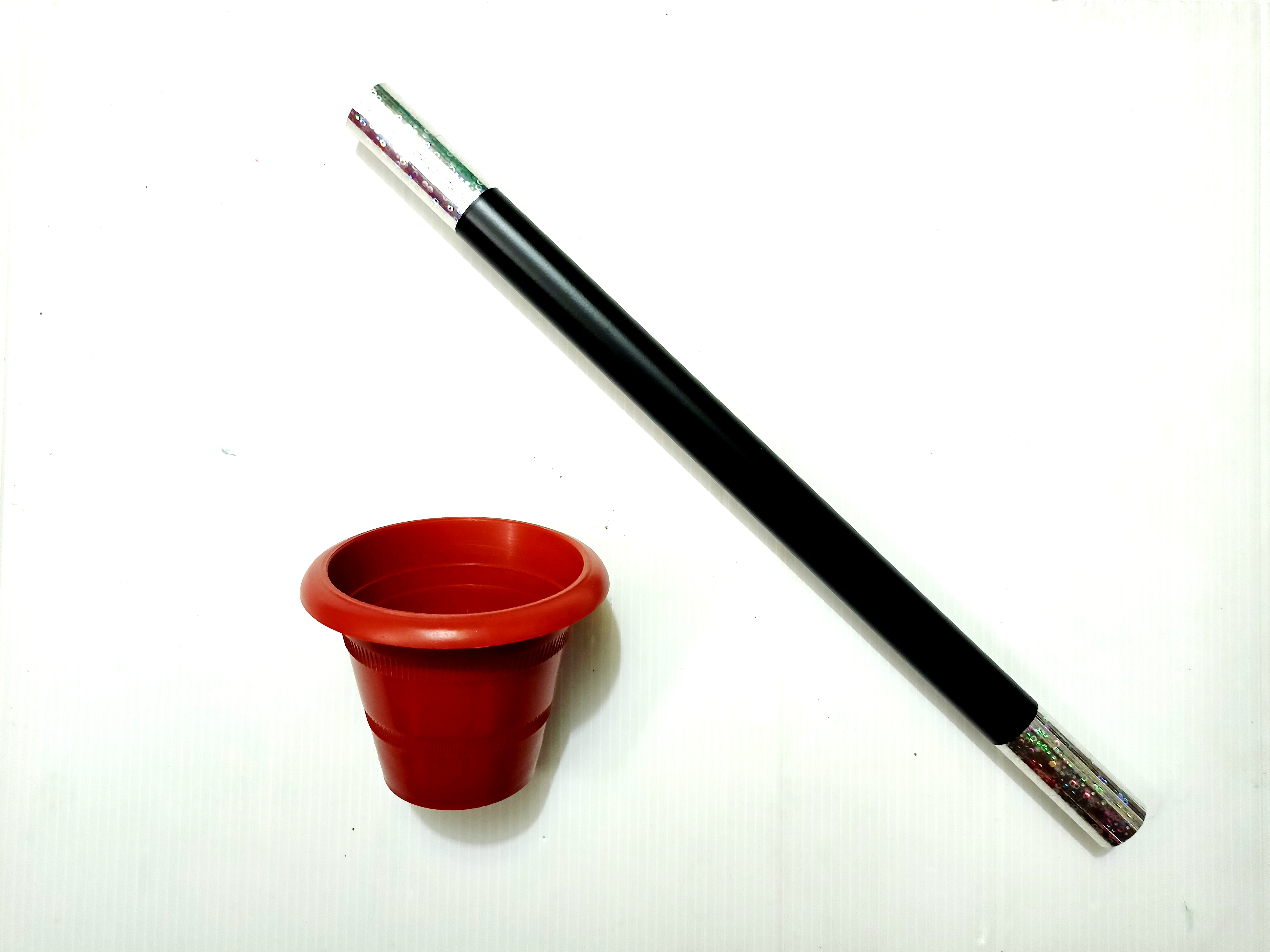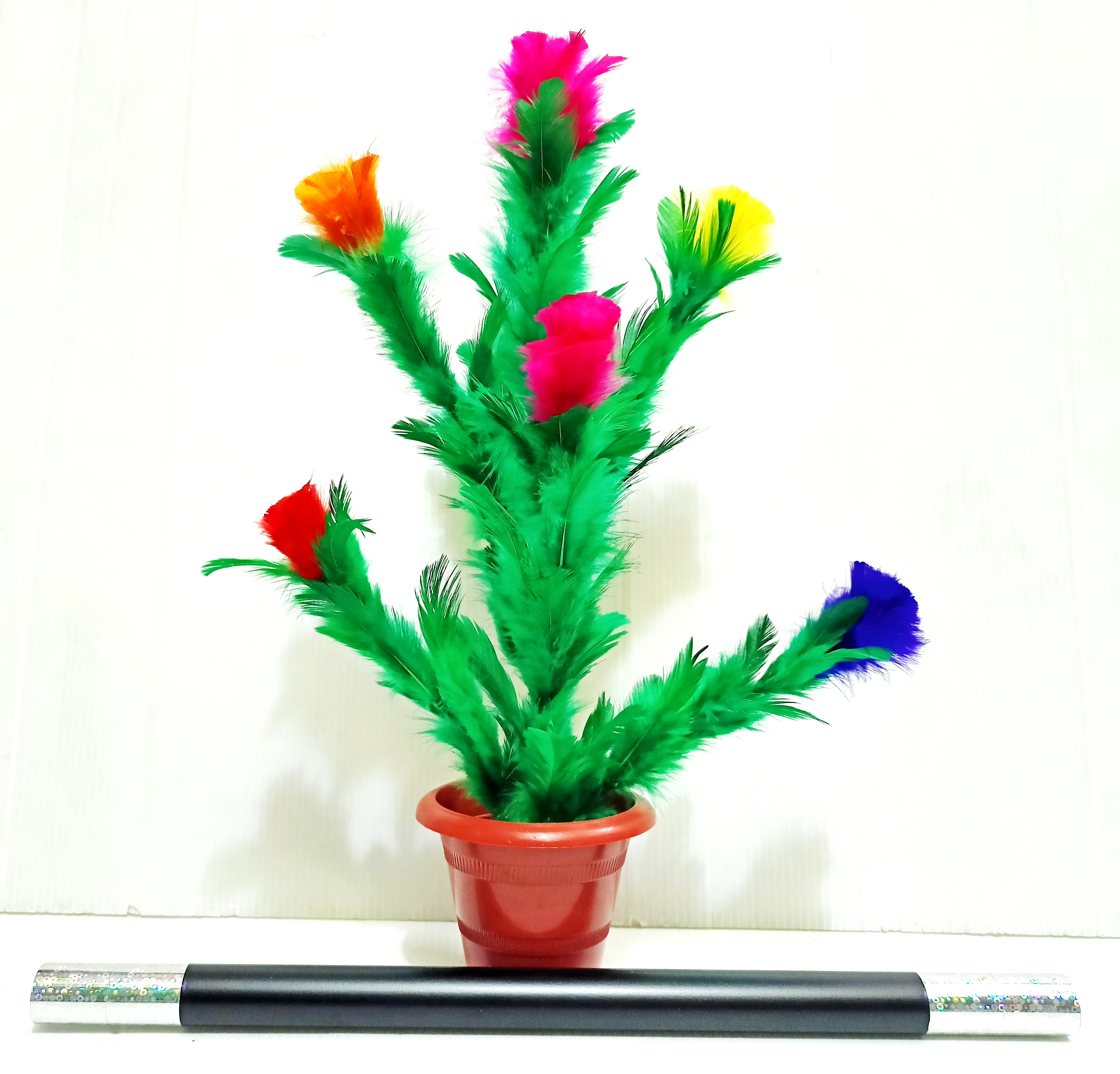 MAGICIAN SHOWS A MAGIC WAND & AN EMPTY TOB.THEN HE TOUCHES THE WAND ON THE TOP OF THE TOB. WOW A BEAUTIFUL FEATHER TREE IS APPEAR ON POT.