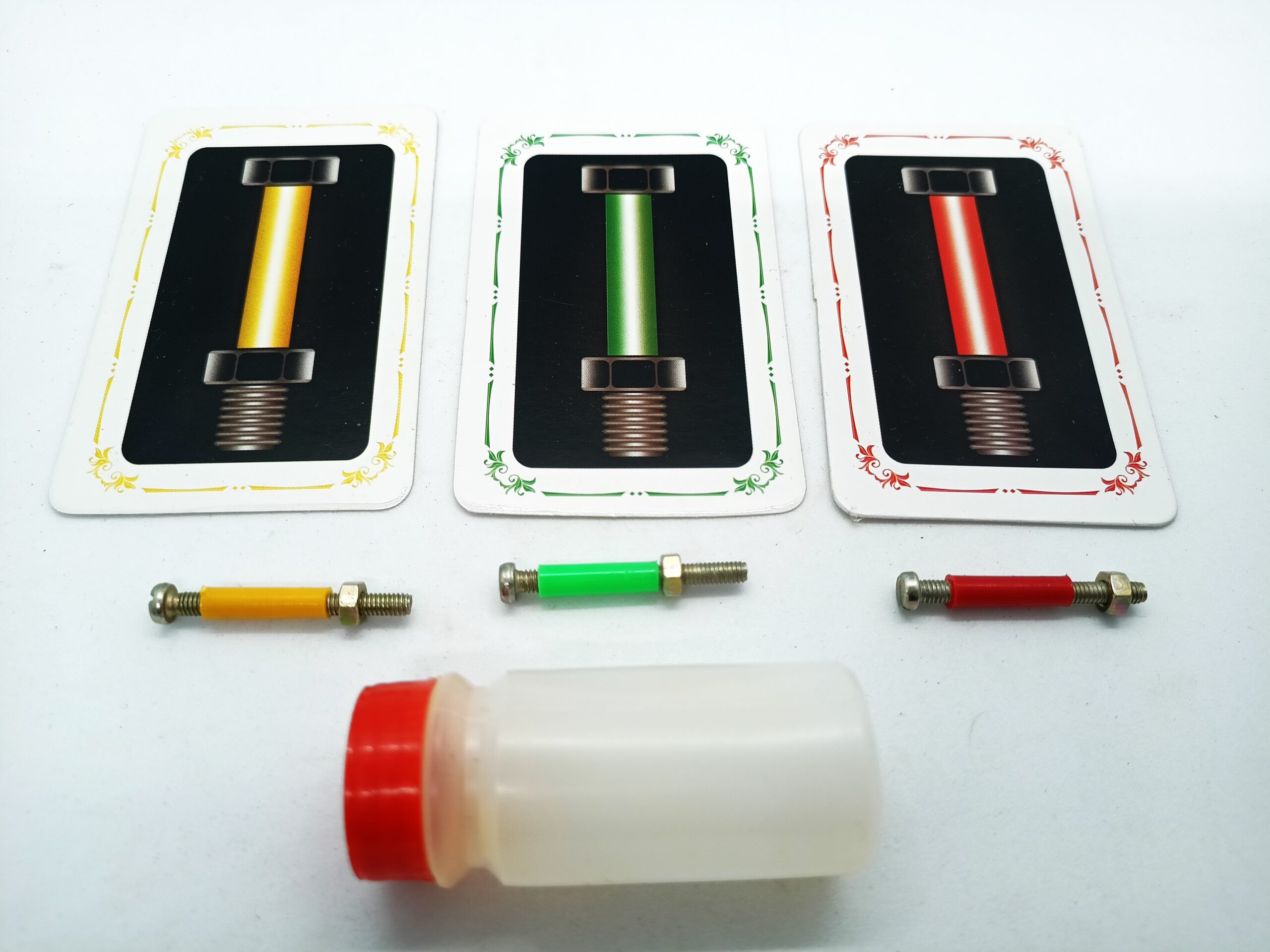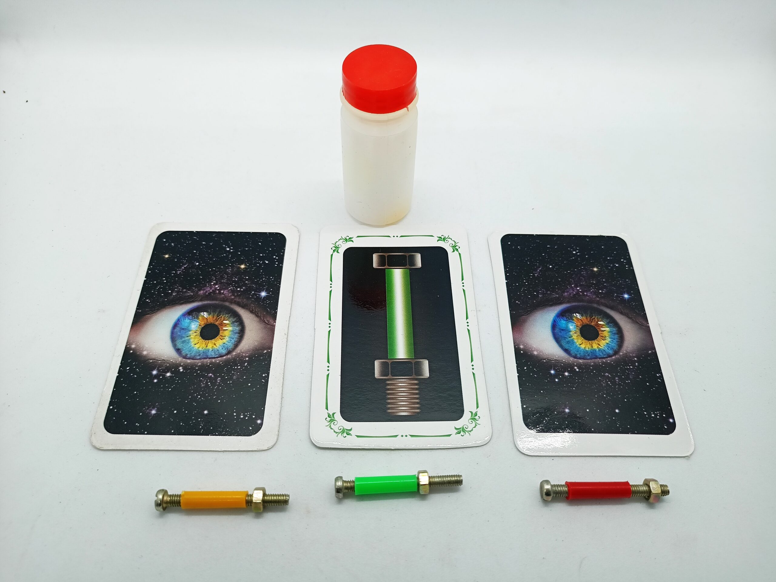 2. 3 NUT BOLT MYSTERY:- WHICH CARD PUBLIC SELECT FROM FACE DOWN POSITION, THAT NUT BOLT WILL BE OPEN TO INDICATE PUBLIC SELECTED COLOR.