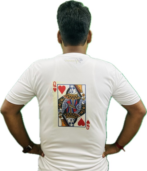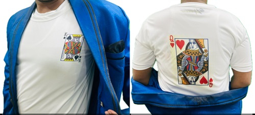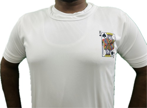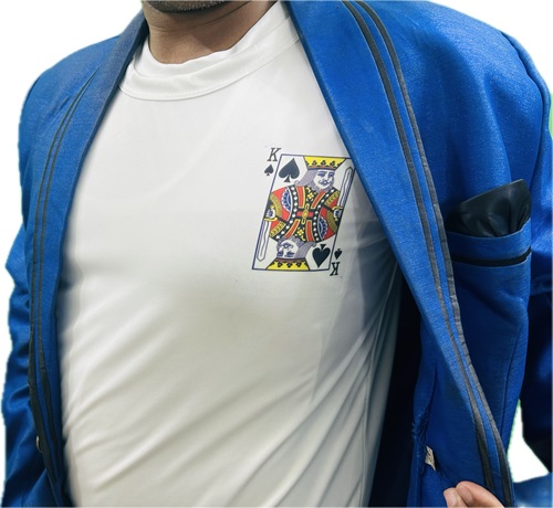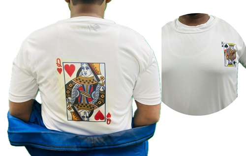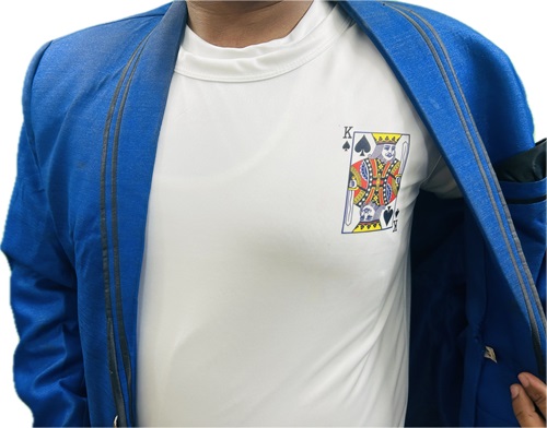 MAGICIAN SHOWS A MIXED DECK OF CARD IN HIS HAND. THEN HE TELLS 2 PERSONS FROM CROWD TO SELECT 2 DIFFERENT CARDS FROM THAT DECK. AFTER SELECTION, MAGICIAN TELLS THOSE CARDS NAMES. BUT THAT NAMES MAGICIAN TELLS WRONG. THEN MAGICIAN GUESSES ANOTHER NAME, THAT WAS ALSO WRONG. FINALLY MAGICIAN OPEN HIS BLEZAR & 1ST PERSON CARD PRINT IS SHOWING AT HIS CHEST SIDE PORTION ON T-SHIRT. THEN HE TURNS BACK & THE 2ND PERSON CARD PRINT IS SHOWING AT HIS BACK ON T-SHIRT. PUBLIC WERE VERY SURPRISED.