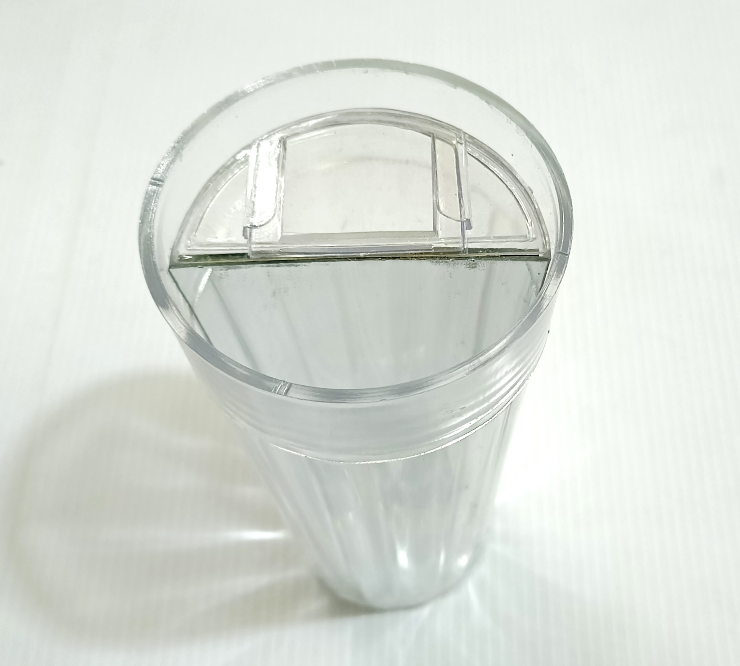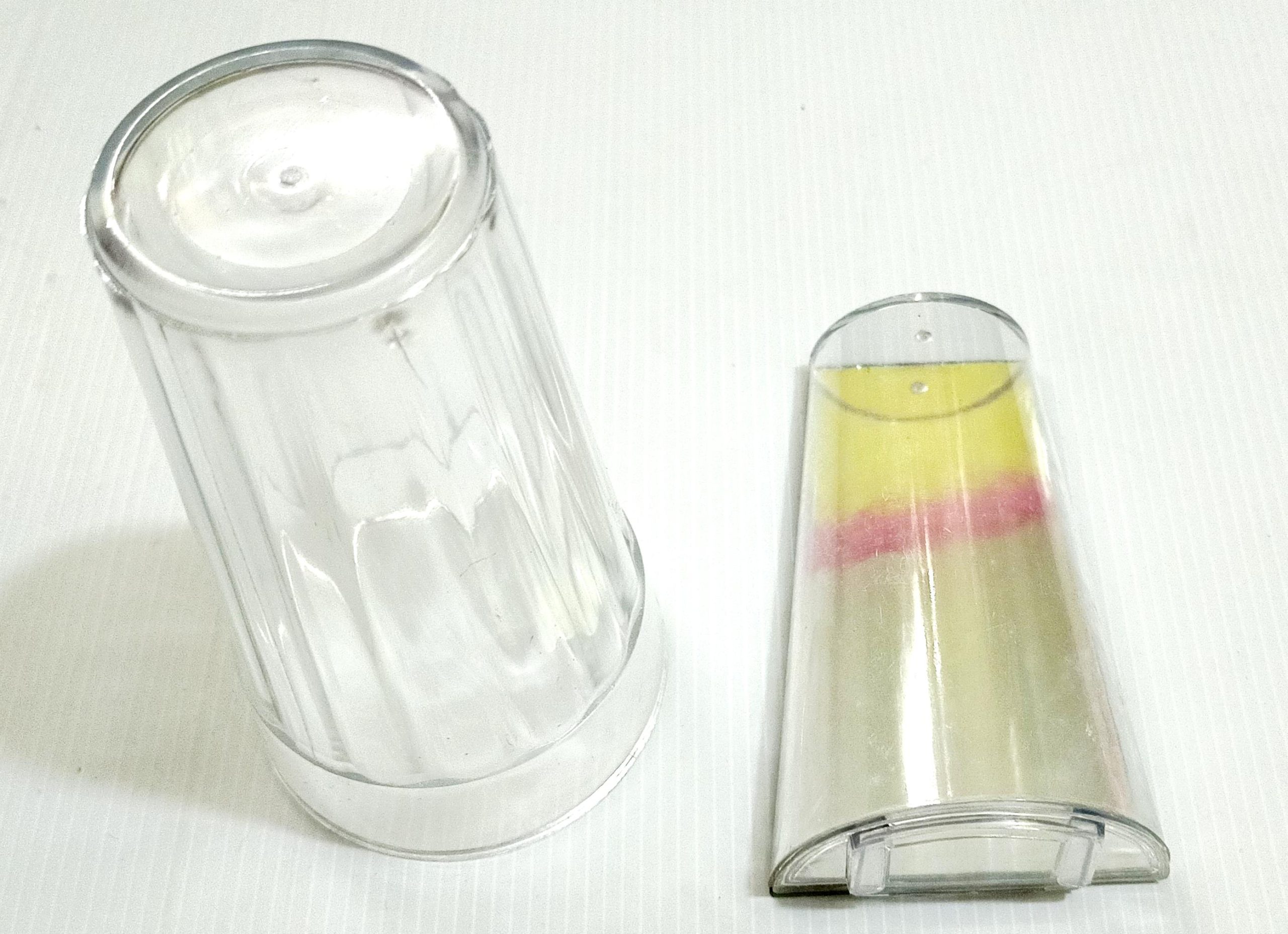 Magician can change one silk to other color silk. Another presentation is Magician puts a white or orange silk inside the glass, then the silk turn into milk or orange juice. It comprises of a clear tumbler, with a mirror partition. Any item placed in the rear section of the glass behind the mirror cannot be seen by the audience if the glass is a little above eye level.