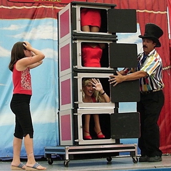 Magician cut a girl in 4 pcs in a big box & separate the box in 4 small boxes. Then mis arrange the boxes & see that the body parts of the lady are wrongly joined by him. Then again in proper sequences he join the 4 boxes & appear the lady safely.
