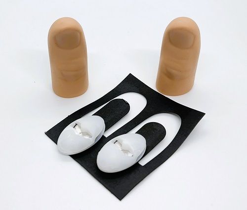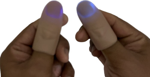 Set of 2 thumb lights with rubber thumb tips. very good quality & easy to perform magic. Children also may perform. Full instruction with tutorial video included with it. The magician shows bare hands, then 1 red light appears on his thumb. Then the light jumped on the other thumb. Then he acts to eat the light & takes it out from his ear. He puts the light on one ear & it comes out from the other ear. Many routines you may perform with it. Super attractive magic trick for stage & home both shows.