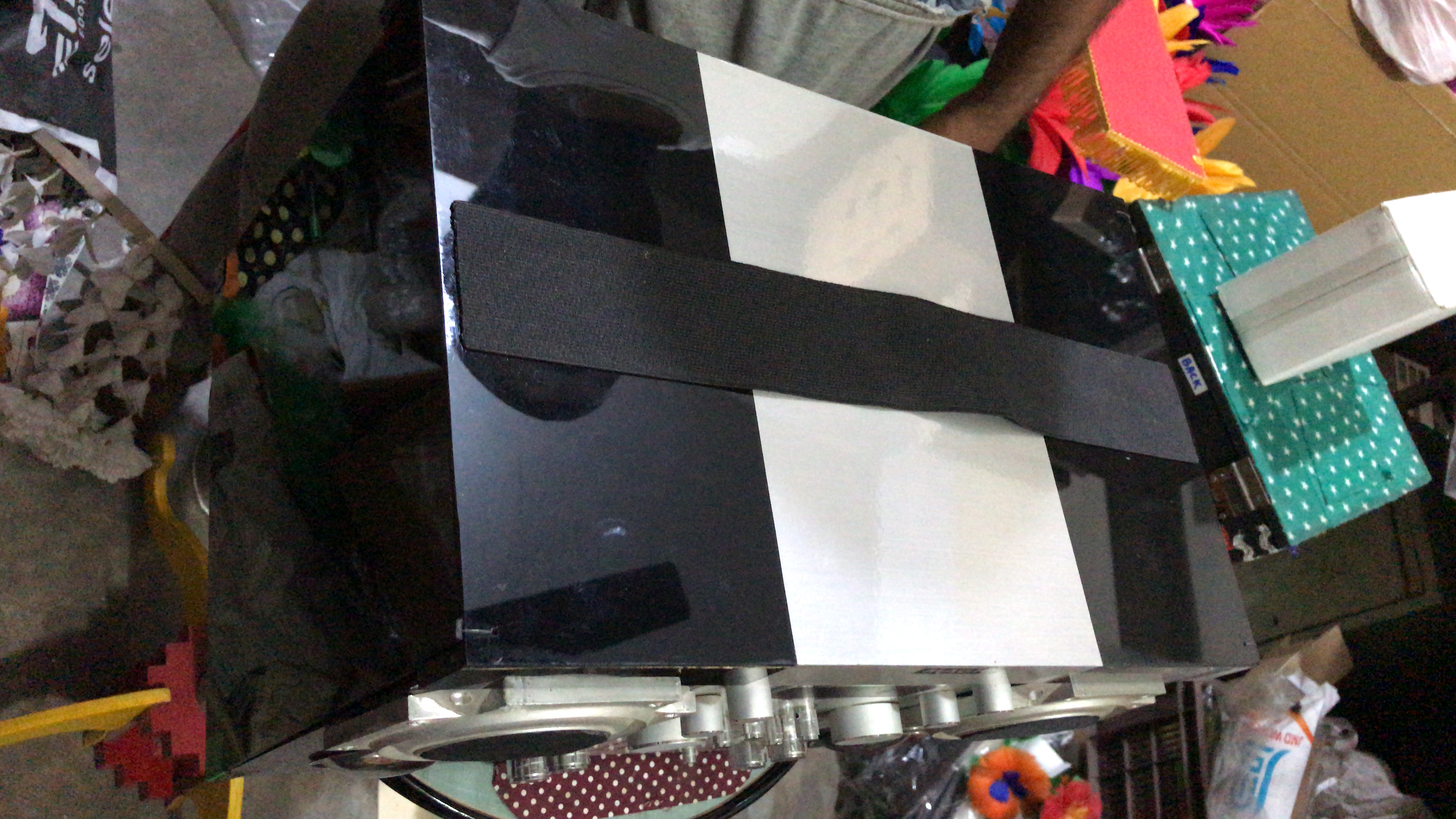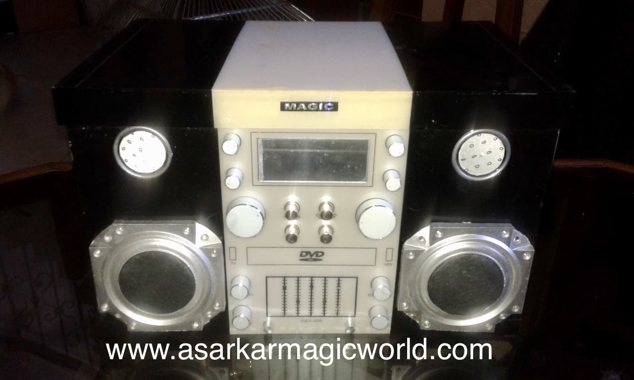 Magician shows an empty cloth & put the cloth on table. Then he lifts the cloth, Magically a big Music player appeared.