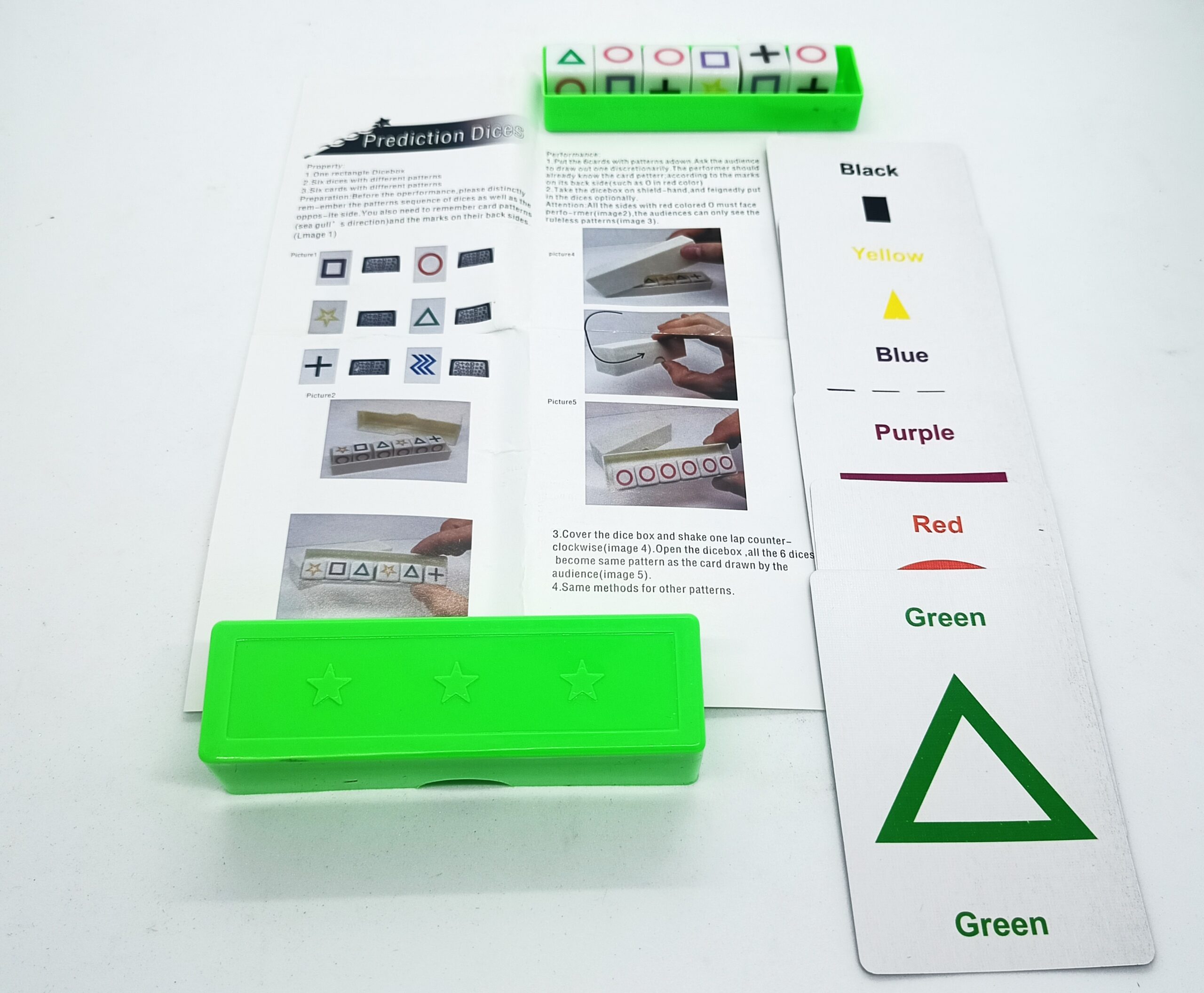MAGICIAN SHOWS 6 PCS CARDS WITH 6 DIFFERENTS ESP SIGNS ON IT & 1 BOX WITH 6 ESP SIGNS DICES. THEN HE GIVES THE CARDS TO PUBLIC TO SHUFFEL. THE PUBLIC PLACES THE CARDS UPSIDE DOWN ON THE TABLE. THEN MAGICIAN TELLS THEM TO TOUCH ON ANY OF THE CARD WITHOUT SEEING IT. THEN MAGICIAN PLACES THE DICES INSIDE THE BOX & SHAKES IT. WOW ONE OF THE SPECIFIC SIGN APPEARED ON ALL THE DICES ON TOP. THEN PUBLIC TURN THAT CARD. THAT CARD IS MATCHED WITH THAT DICES SIGN MAGICALLY.