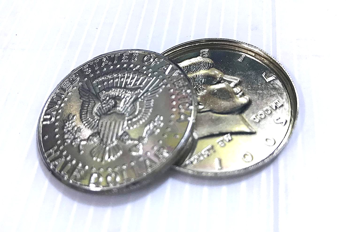 Make a US Half Dollar multiply, disappear or penetrate your hand. Change the half dollar to a quarter or vanish it using a reel or magnet. We supply a shimmed half dollar shell and coin.