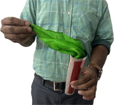 MAGICIAN SHOWS A ROLLING EMPTY TUBE SHEET. THEN HE OPENS IT & SHOWS EMPTY. THEN HE PRODUCES SILKS OUT OF THE TUBE. SILK, CURRENCY NOTE & OTHER FOLDABLE PROP YOU MAY PRODUCE FROM IT.