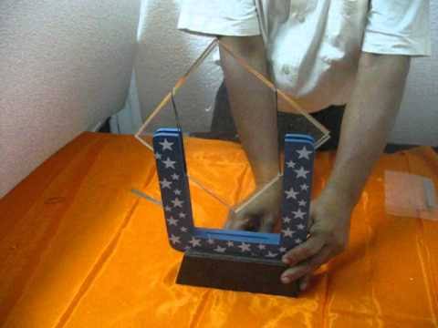 Two plates of Plexiglass are shown and examined by any spectator. Then they are bound with rubber bands by any spectator. These rubber-banded Plates are set in a wood frame which supports them in mid-air. The magician now steps back, and instructs the spectator to throw the remaining cards from the deck at the Plexiglass Plates. The cards hit the glass. But One card, with a torn corner appears between the 2 plates.