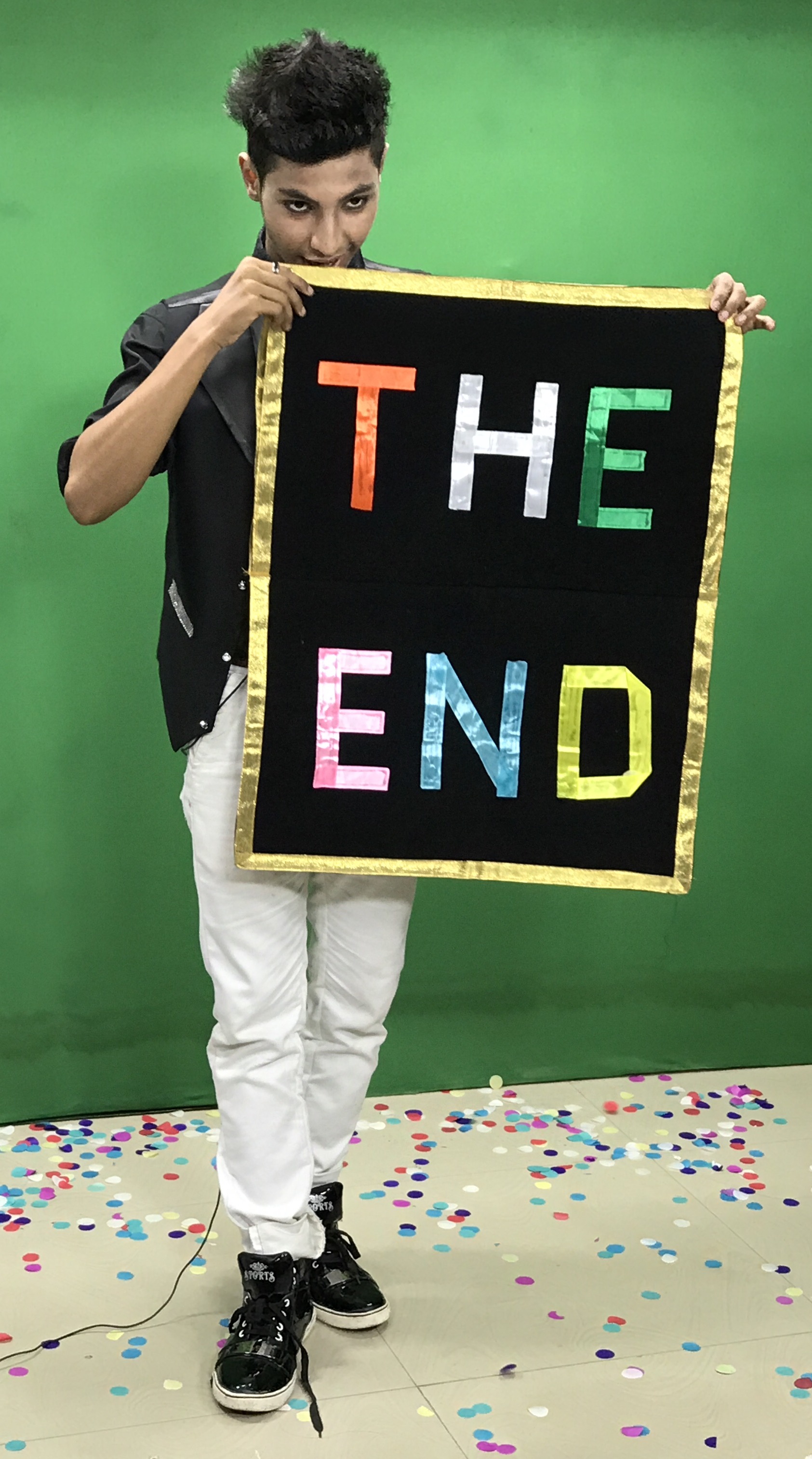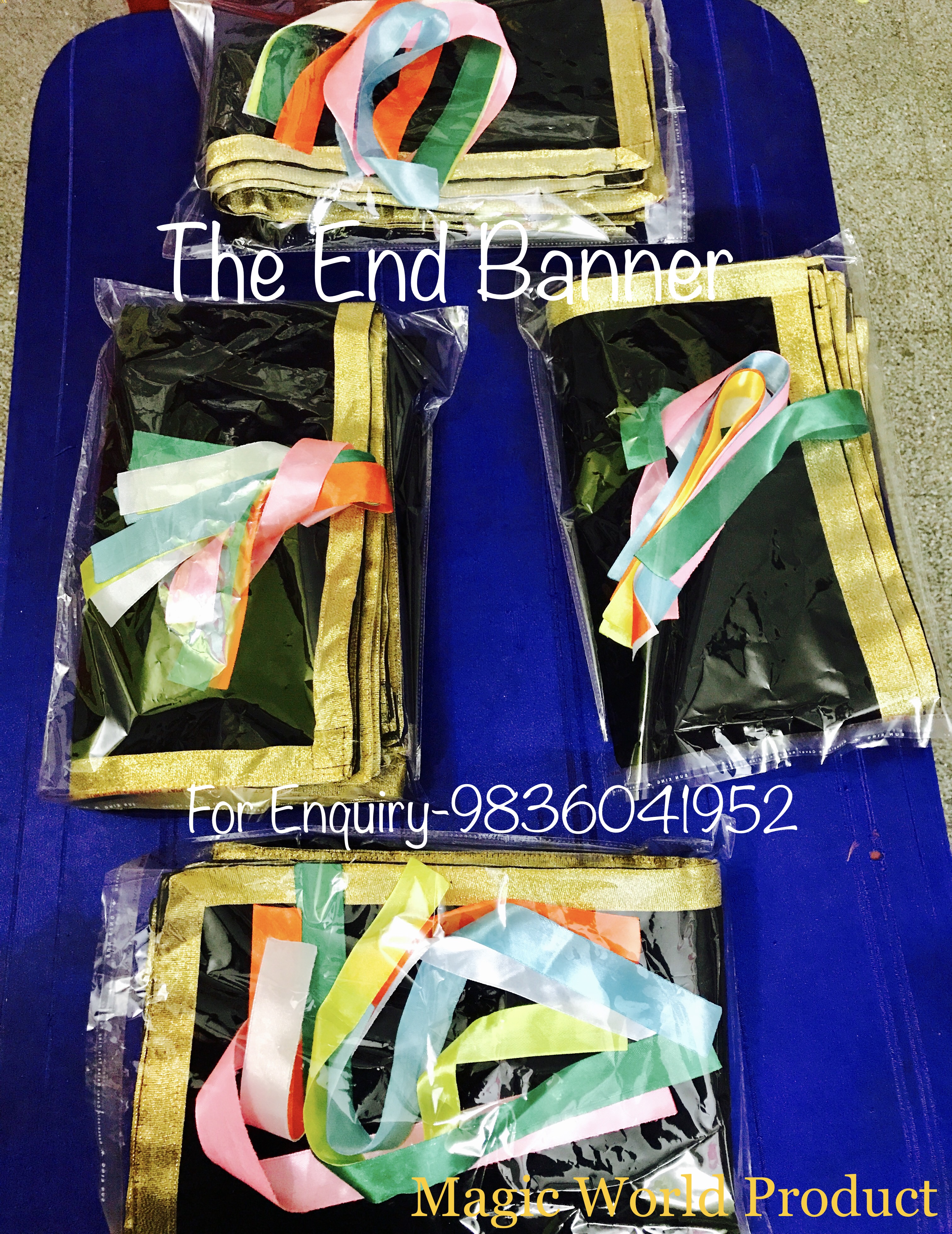 Magician shows a velvet banner empty from both sides. Then fold the banner from middle. Put some colourful ribbons in the folded banner. Then shake the banner. Autometically with the ribbons The End message is created in the banner.