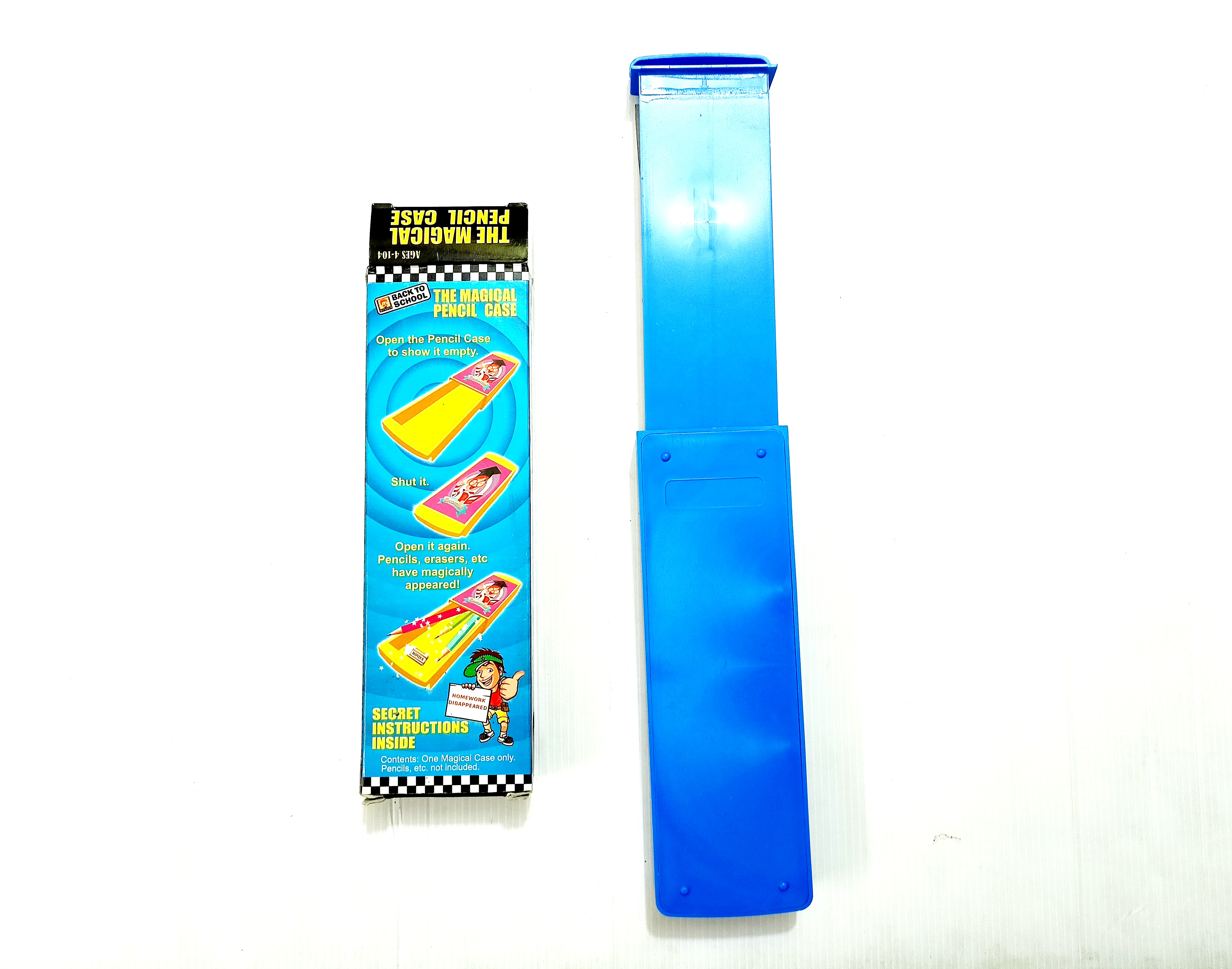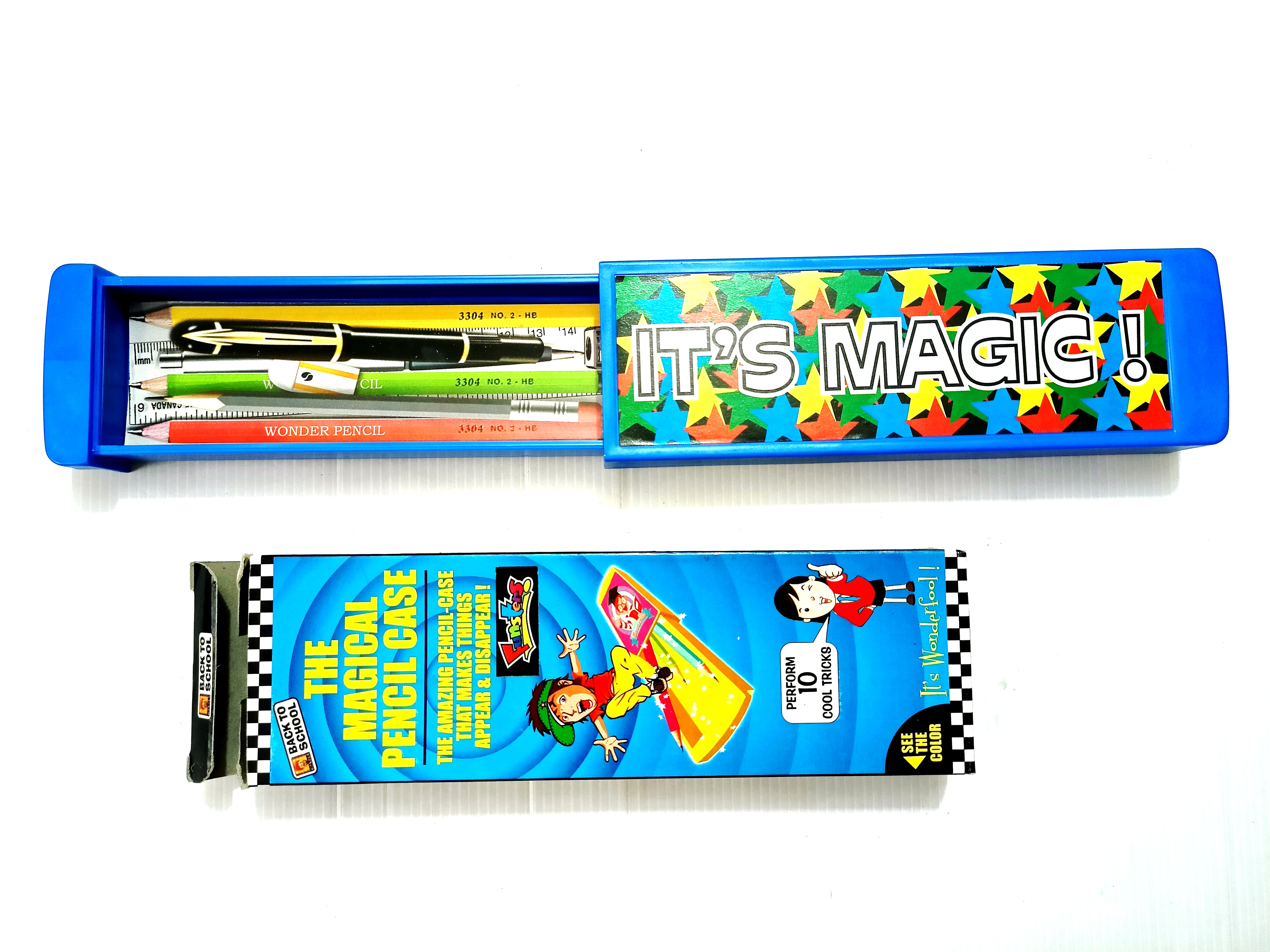 MAGICIAN SHOWS AN EMPTY PENCIL BOX. THEN HE PRODUCES PENCIL, PEN, ERASER, CHOCOLATE ETC OUT OF THE BOX MAGICALLY. EASY TO PERFORM. VERY GOOD ITEM FOR CHILDREN.