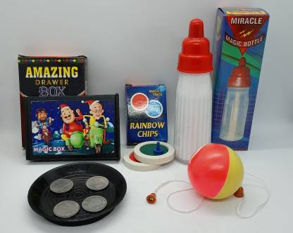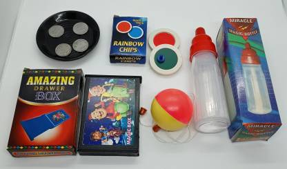 5 SUPER MAGIC TRICKS FOR CHILDREN & SENIOR BOTH . ANY ONE CAN LEARN & PERFORM EASILY. FULL INSTRUCTION WITH TEACHING VIDEO INCLUDED. TRICK 1: MAGIC MILK BOTTLE IN WHICH MILK APPEAR & DISAPPEAR AGAIN & AGAIN. TRICK 2: AMAZING DRAWER BOX BY WHICH YOU MAY APPEAR OR DISAPPEAR NOTE OR ANY THING. TRICK 3. COIN TRAY, BY WHICH YOU MAY APPEAR COINS OR DOUBLE COINS. TRICK 4: RAINBOW CHIPS. YOU MAY CHANGE THE BOTH SIDES DISCS COLORS BY MAGIC. TRICK 5: OBEDIENT BALL. ACCORDING TO YOUR COMMAND THE BALL RISES UP & DOWN AGAIN & AGAIN. FULL INSTRUCTION WITH TEACHING VIDEO INCLUDED WITH SET. A GREAT MAGIC SET.